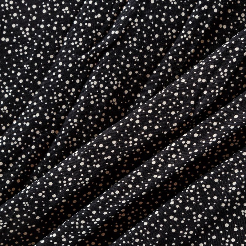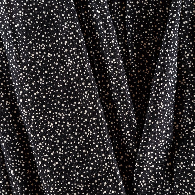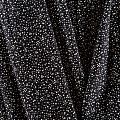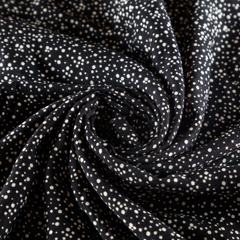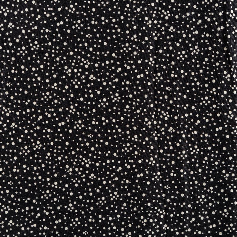 Плотная и мягкая ткань черного цвета с хаотичным мелким принтом молочного оттенка, имеет саржевое плетение и характерный диагональный рубчик на поверхности. Отлично сохраняет форму, не сильно мнется и не деформируется в процессе эксплуатации. Красиво ложится в складки, поэтому прекрасно подойдет на длинные драпированные юбки и платья, на свободные брюки или шорты, топы, комбинезоны, а также для домашней одежды.