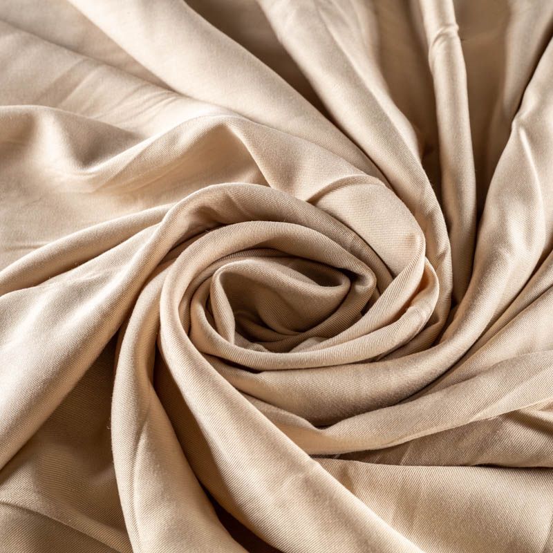 Плотная и мягкая ткань, имеет саржеве плетение и характерный диагональный рубчик на поверхности. Отлично сохраняет форму, не сильно мнется и не деформируется в процессе эксплуатации. Красиво ложиться в складки, поэтому прекрасно подойдет на длинные драпированные юбки и платья, на свободные брюки или шорты, топы.