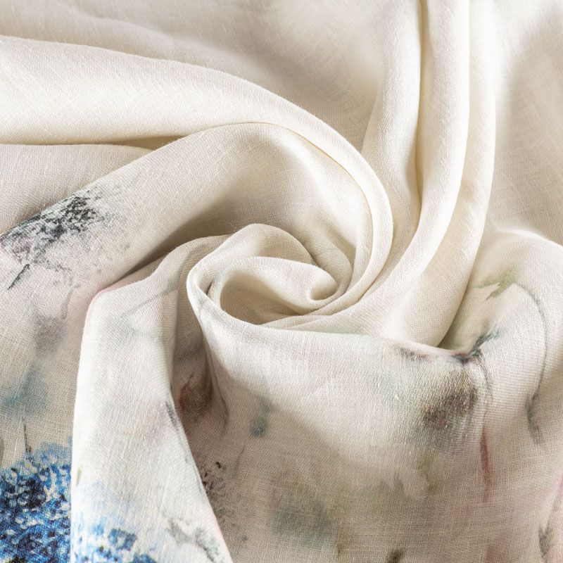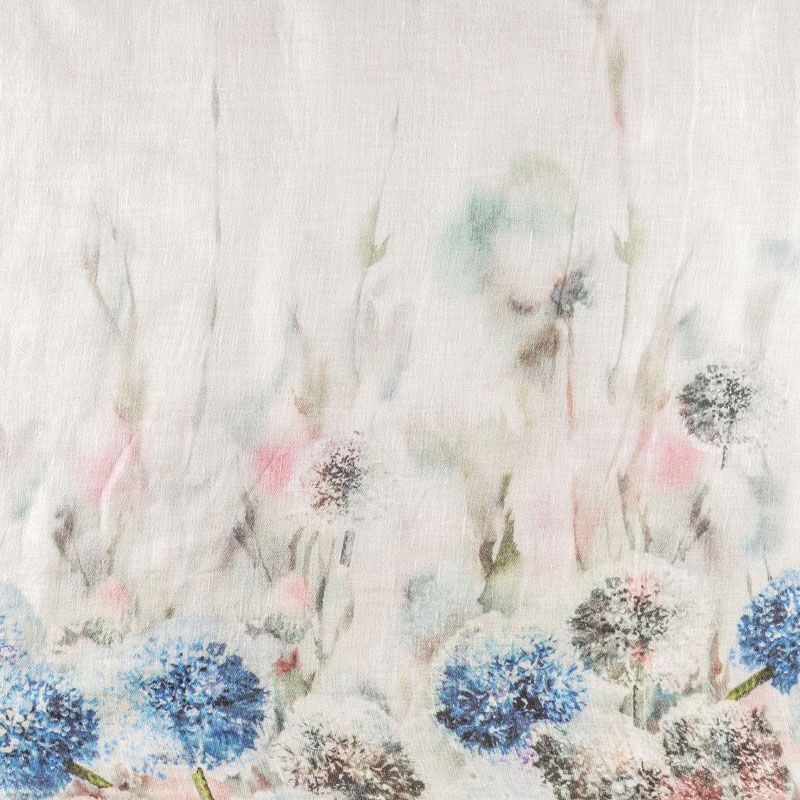 Ткань изготовлена изо льна методом полотняного переплетения. Она прочная, достаточно плотная, держит форму и обладает ярко выраженной фактурой. Эта ткань подойдет для пошива штор, римских штор, предметов столового белья. Её можно использовать для декора интерьера загородного дома или веранды. На расстоянии 1 м от низа тюля расположен принтованный акварельный рисунок в сине-розовых оттенках.