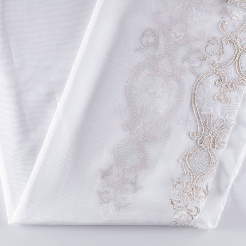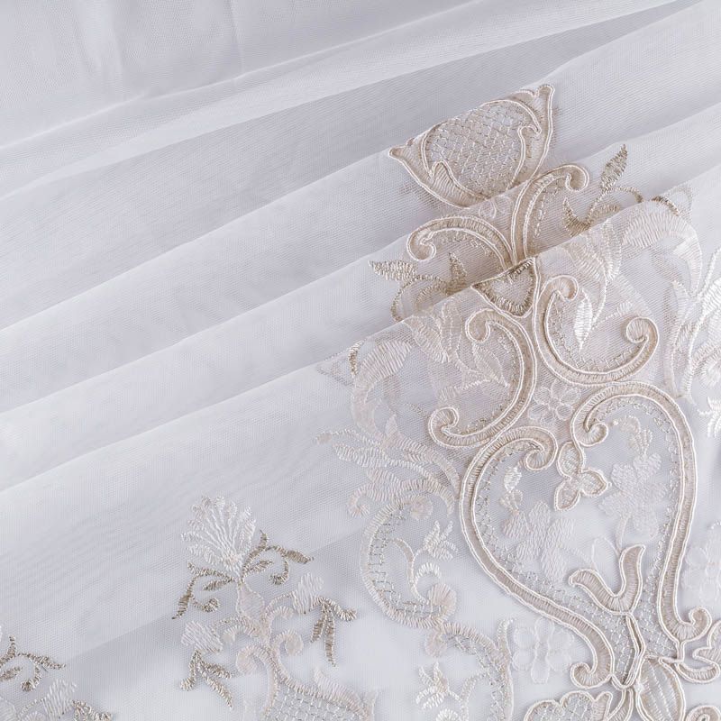 Сетка с вышивкой – это роскошный элемент дизайна, который преобразит любое помещение. Она отлично пропускает воздух, поэтому быстро сохнет после стирки. Прочная, ткань прослужит долго. Выдерживает большое количество стирок. Легкая, фактура ткани практически невесома, поэтому можно не опасаясь крепить ее даже на самый тонкий карниз. Сетка с вышивкой – это роскошный элемент дизайна, который преобразит любое помещение. Она отлично пропускает воздух, поэтому быстро сохнет после стирки. Прочная, ткань прослужит долго. Выдерживает большое количество стирок. Легкая, фактура ткани практически невесома, поэтому можно не опасаясь крепить ее даже на самый тонкий карниз. Тюль украшен  ажурным купоном бежевого оттенка с добавлением люрексной нити на высоту 75 см, без утяжелителя, край фигурный.