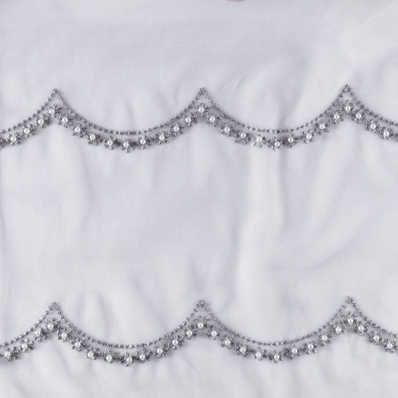 Сетка с вышивкой – это роскошный элемент дизайна, который преобразит любое помещение. Она отлично пропускает воздух, поэтому быстро сохнет после стирки. Прочная, ткань прослужит долго. Выдерживает большое количество стирок. Легкая, фактура ткани практически невесома, поэтому можно не опасаясь крепить ее даже на самый тонкий карниз. Нежная цветочная вышивка с круглыми бусинами серебристо-серого оттенка расположена ярусами, нижний край украшен вышитым фестоном, без утяжелителя, фигурный.