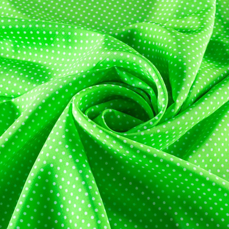 Плательно-рубашечная итальянская вискоза яркого салатового оттенка с принтом в мелкий горошек. Натуральная, дышащая ткань, очень приятная к телу, отлично драпируется, струится, не просвечивает. Хорошо подойдет для пошива платьев, рубашек, платьев-рубашек, блуз, юбок, брюк, летних костюмов, пыльников, детской одежды.