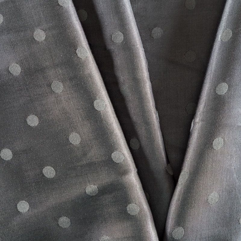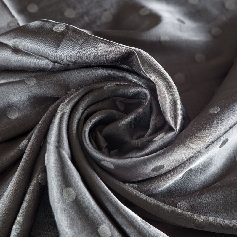 Атласная жаккардовая вискоза серого оттенка. Ткань плотная, но пластичная, хорошо драпируется и струится. Поверхность ткани гладкая, атласная, приятная на ощупь. Подойдет для пошива платья, сарафана, топа, блузки, рубашки, юбки, костюма в пижамном стиле, брюк свободного кроя, а также как подклад для верхней одежды.