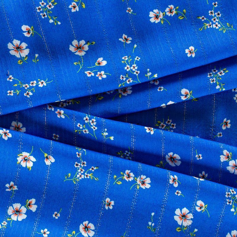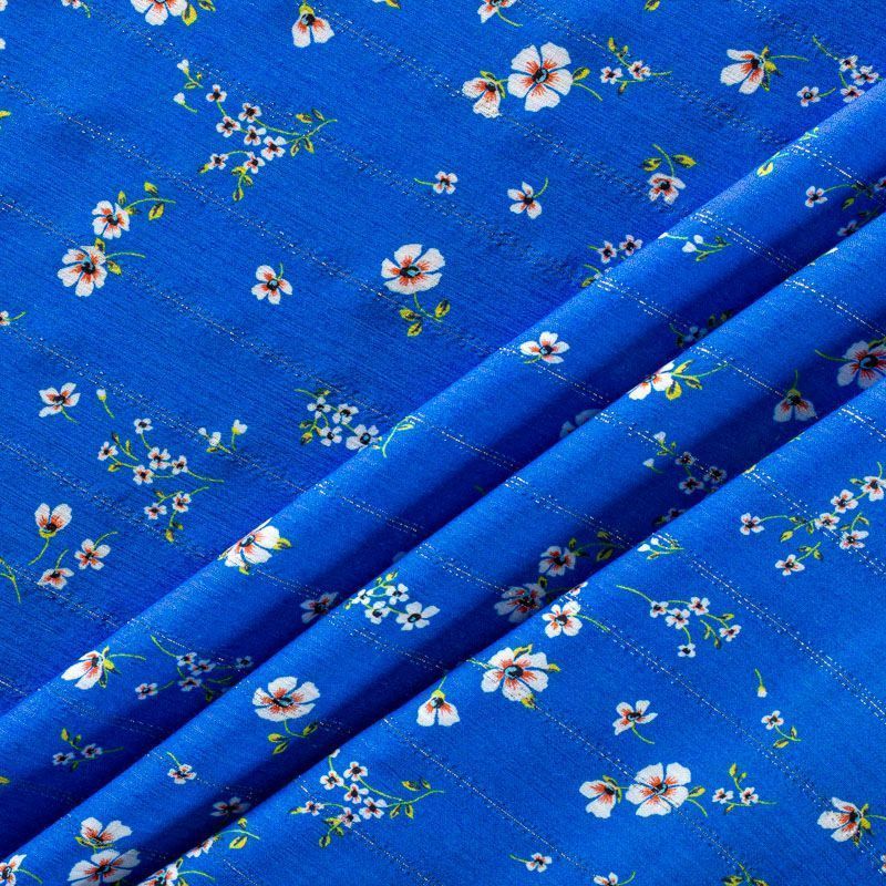 Итальянская плательно-блузочная вискоза с мелким цветочным принтом на васильковом фоне декорирована тонкой люрексовой полоской. Ткань очень пластичная, отлично драпируется и струится, мягкая и приятная на ощупь, не просвечивает. Прекрасно подойдет для пошива платья, топа, блузки, юбки.