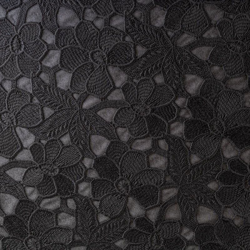 Очень эффектная вышивка на сетчатной основе черного цвета с мелкой ячейкой, мягкая и пластичная. Вышивка с цветочными мотивами в тон основе, плотная, расположена по всем полотну. Ткань приятная к телу, не колется, не цепляется. Идеальна для эффектных вечерних нарядов и для повседневного образа в виде платья-футляра, топа, блузки, летнего жакета, кардигана, брюк или шорт. Требуется подклад.