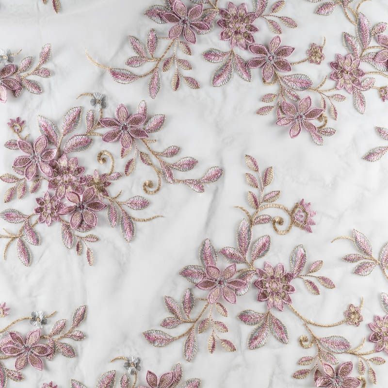 3D вышивка на сетке телесного оттенка. Мягкая, пластичная сетка украшена объемным флористическим узором в розово-зеленых тонах. Цвет сам по себе очень нежный, но если сложить ткань в несколько слоев, тон становится более насыщенным. Полотно легкое, воздушное, матовое. Идеален для вечерних нарядов, платьев на выпускной бал, бальных костюмов, пышных юбок-пачек, а также блузок.