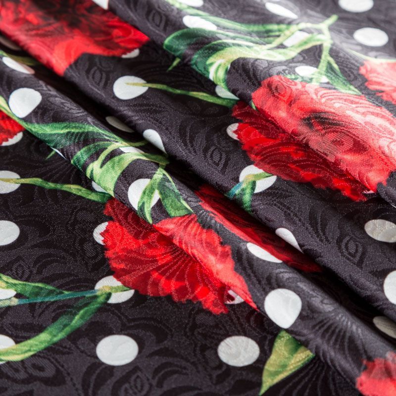 Нарядный жаккард черного цвета в белый горох в сочетании с яркими акцетными цветами, расположенными по всему полотну. Ткань плотная, хорошо драпируется и держит форму, с красивой фактурой, образованной жаккардовым плетением. Ткань обладает высокой прочностью, не мнется и не просвечивает. Идеально подходит для летнего пальто, кардигана, жакета, костюма, юбки или шорт.