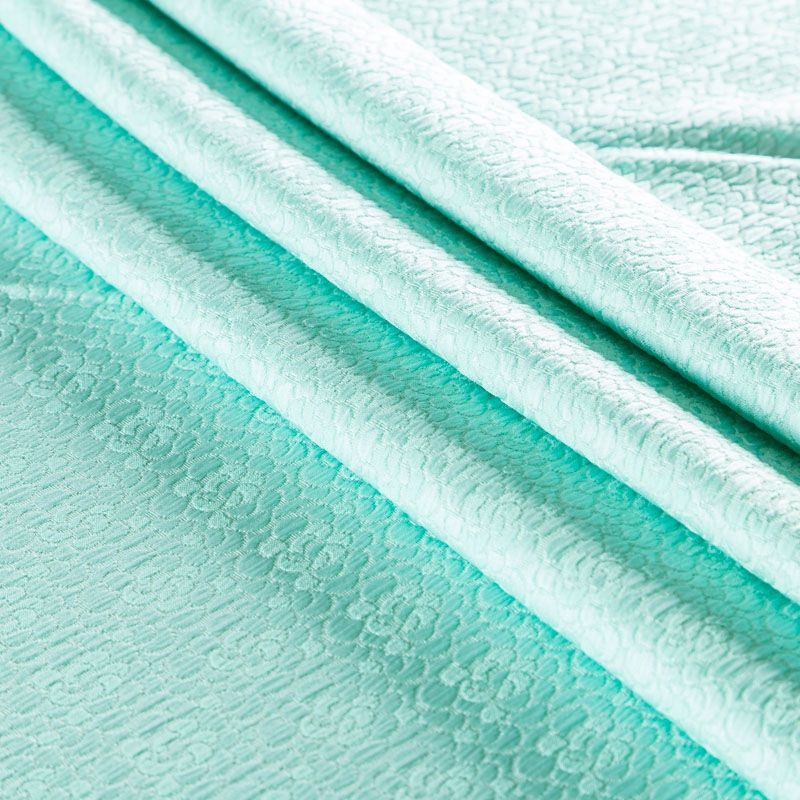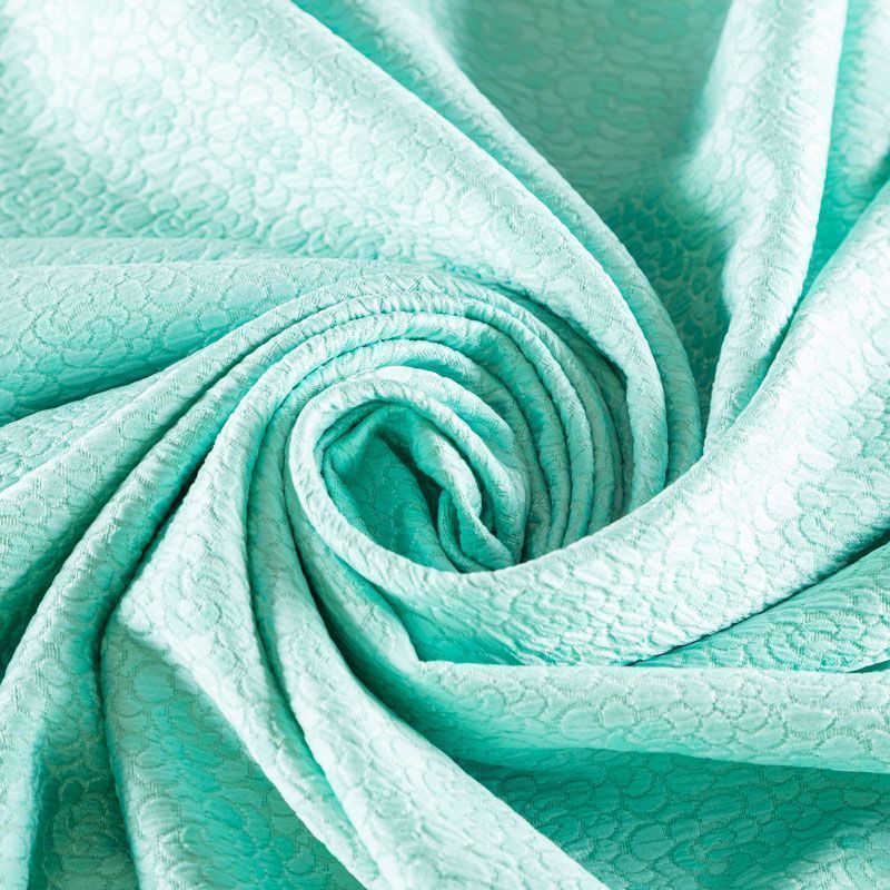 Нарядный жаккард на хлопковой основе с красивым стилизованным орнаментом мятного оттенка. Ткань легкая, но плотная, поверхность со сдержанным блеском объемная и текстурная, хорошо драпируется и держит форму, тянется за счет эластана в составе, не просвечивает. Подойдет для пошива нарядных вечерних костюмов, платьев-футляров в стиле Dior, жакетов, топов, легких пальто, бомберов, юбок или шорт.