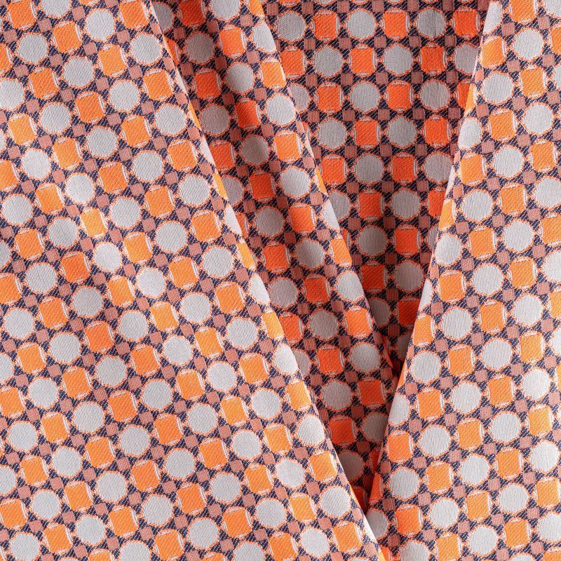 Мягкий жаккард с ярким геометрическим узором. Ткань пластичная, непрозрачная, поверхность фактурная, приятная на ощупь, тянется за счет эластана в составе, немного жержит форму, хорошо драпируется. Будет комфортна для пошива костюма, женственного платья, юбки, брюк, шорт, легкого пальто или мягкого бомбера.