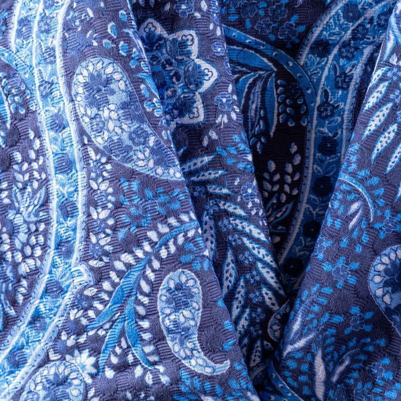 Итальянский хлопковый жаккард с принтом пейсли в синих ярких оттенках. Ткань средней плотности, поверхность матовая, объемная, фактурная, хорошо драпируется и держит форму, не тянется, не просвечивает. Подойдет для пошива костюмов, платьев-футляров, жакетов, топов, летних пальто, бомберов, юбок или шорт.