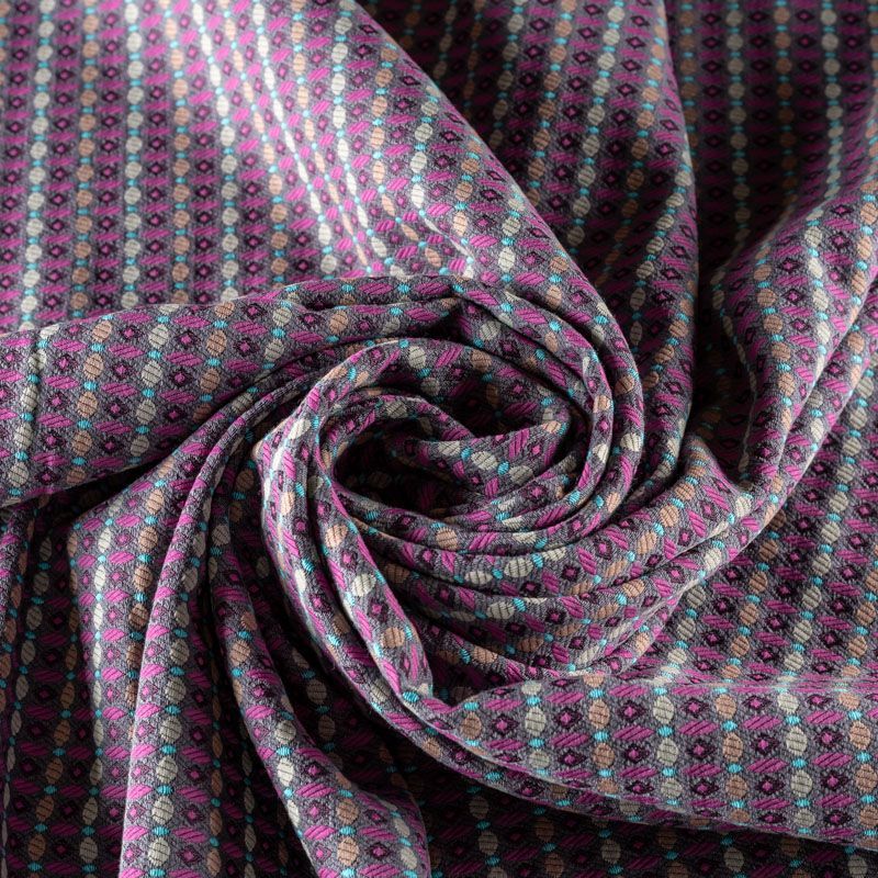 Мягкий хлопковый жаккард в сером цвете с разноцветным мелким абстрактным узором. Ткань пластичная, непрозрачная, приятная на ощупь, тянется за счет эластана в составе, форму не держит, но хорошо драпируется красивыми складками. Будет комфортна для пошива костюма, женственного платья, юбки или брюк.